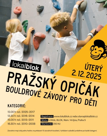 Tradiční dětský boulderový závod Pražský opičák se uskuteční v úterý 2. prosince 2025. Akce je určena pro děti od 0 do 17 let, rozdělené do čtyř věkových kategorií. Každá z nich bude mít hodinu na zdolání deseti boulderů. Vyhlášení výsledků proběhne hned po skončení závodu dané kategorie – oceněni budou první tři chlapci a první tři dívky, kteří si odnesou krásné věcné ceny od partnerů akce. Závod je otevřen nejen pro lezecké kluby z celé republiky, ale i pro širokou veřejnost. Přijďte si zazávodit nebo fandit!